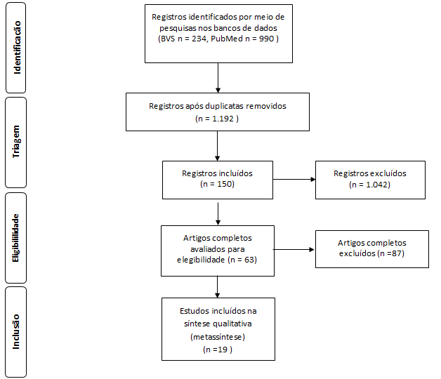 Foram identificados ao total 1224 estudos, sendo 234 resumos elegíveis na busca via BVS e 990 resumos elegíveis via PubMed. Após aplicação dos critérios de inclusão e exclusão, e da identificação de duplicidades, restaram 19 artigos, conforme figura 1.