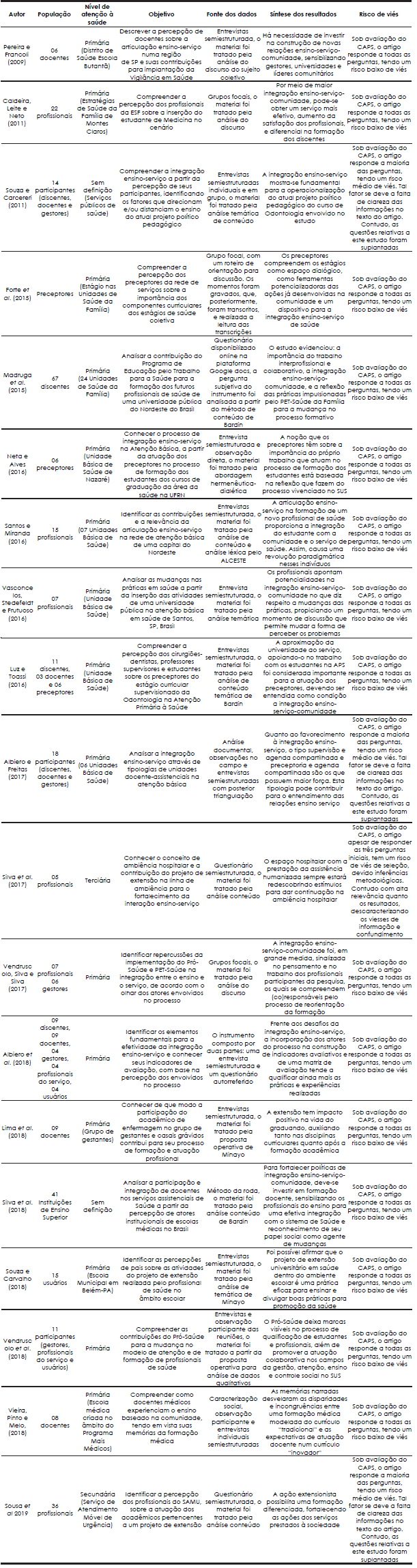 Na sequência, a tabela 1 apresenta os estudos sobre as integrações, em ordem cronológica (ano de publicação), para mostrar a evolução em nosso país do papel social da Universidade. A tabela segue o modelo orientado pelo protocolo PRISMA, descrevendo assim a população, o objetivo, a fonte dos dados, síntese dos resultados e analise quanto aos riscos de viés nos artigos, conforme preconiza o citado instrumento CAPS.