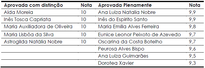 Interessante notar, a partir do exposto no quadro acima, que havia duas formas de aprovação: aprovadas com distinção, para aquelas estudantes com nota máxima, e aprovadas plenamente, para as demais moças cujas notas eram menores. Outro fato que chamou a atenção foram as diferenças entre as notas: apenas décimos entre uma e outra. Seria um rigor exacerbado ou interesse em destacar determinadas mulheres por um determinado motivo ou para incentivá-las a uma "competição" entre mulheres por algumas terem alcançado notas máximas? Outra indagação que levantamos, conforme descrito anteriormente: das trinta vagas ofertadas e todas ocupadas no início do curso, por que apenas treze moças concluíram o curso?