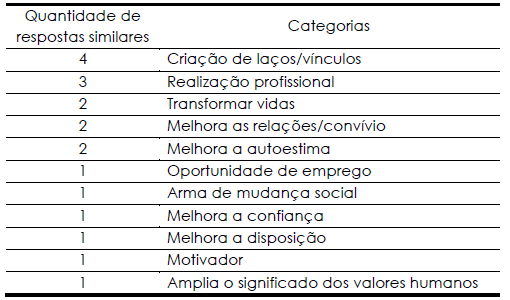 O quadro 1 traz as categorias encontradas com relação à visão dos educadores sobre o projeto quando questionados sobre: “Discorra sobre a importância do projeto na sua vida e na das pessoas que são envolvidas nele”.