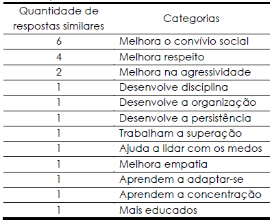 Neste ponto, é fundamental destacar como as respostas aos questionários apontam uma importante melhora no convívio social após a entrada das crianças no projeto, observando atitudes mais respeitosas perante os/as educadores e alunos. Questão que também foi apontada nas entrevistas, que indicam como os participantes se mostravam cada vez mais comprometidos e participativos nas atividades realizadas e que também foi notado pela educadora do projeto Garcia: