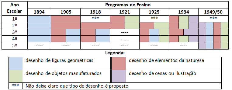 Mediante a figura, como destaca Trindade (2018), observa-se que, ao longo dos programas, as propostas foram alteradas. Constata-se que as propostas se reconfiguram de tempos em tempos. De caráter geral e num exame cronológico, nota-se que, em 1894, a prioridade se concentrava nos desenhos de formas geométricas; em 1905 e 1918, tem-se, além de referências a desenho de modelos geométricos postos ao 3º. e 4º. anos, a sugestão de um novo formato de desenho, de elementos da natureza, como frutas, flores, animais e paisagens. Em 1921, além de observar incidências a esses elementos da natureza, aparecem pela primeira vez prescrições de desenhos de objetos manufaturados, considerados aqui com aqueles que faziam menção a artefatos produzidos pelo homem, como cadeira, casas, igrejas etc.