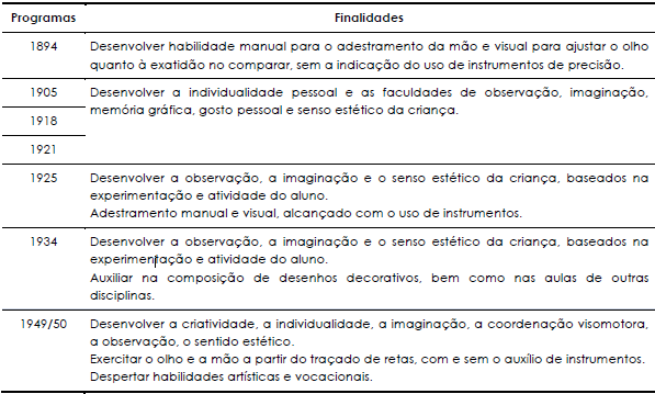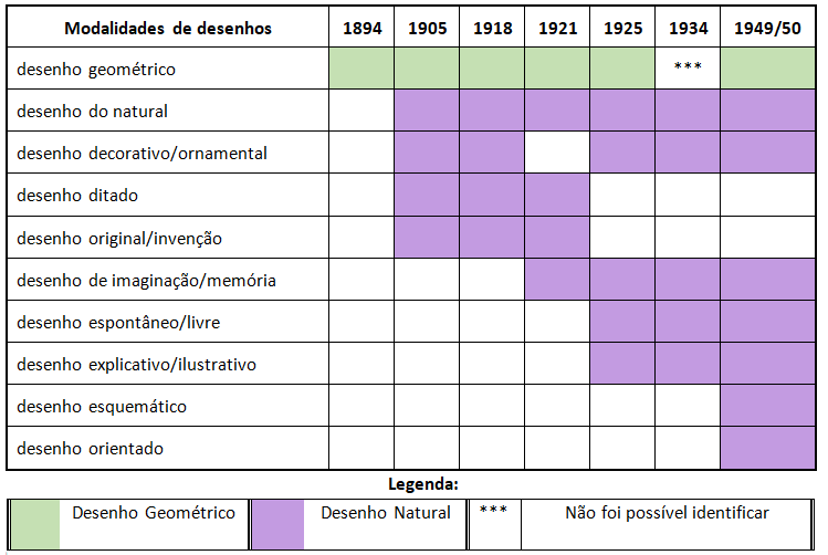 Quando analisado em seus detalhes, e considerando as diferentes vagas pedagógicas de cada época, esse quadro destaca, além de um aumento gradativo no número de modalidades de desenho e permanências por períodos específicos (como o caso do desenho de imaginação e memória que ingressa em 1921 e permaneceu até os programas de 1949/50), uma relação intrínseca com as suas finalidades de ensino, as quais foram alteradas e, significativamente, ampliadas ao longo do tempo.