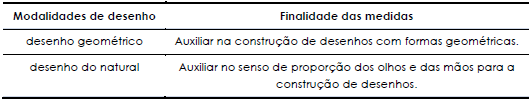 Seguindo esse raciocínio de que as medidas poderiam ser mobilizadas, mesmo que não fosse um saber principal de ensino, Trindade (2018) destacou especificamente uma caracterização sobre a mobilização das medidas no desenho geométrico e no desenho do natural. O resultado apresentado pela autora pode ser sintetizado pelo quadro que segue: