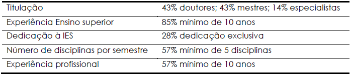 O primeiro documento, que contempla as DCNs dos cursos, não explicita recomendações relativas à demanda pela formação de natureza pedagógica dos indivíduos que compõem o conjunto de docentes, nem aspectos relativos à jornada de trabalho ou à titulação requerida para esse grupo. Encontramos um tópico, de apenas um parágrafo, no referido documento, que aponta resumidamente a necessidade da adoção de uma metodologia de ensino centrada no aluno e o desenvolvimento de habilidades para a solução de problemas complexos; evidencia a mudança da visão do docente de transmissor para facilitador da aprendizagem; e observa que o projeto do curso deve explicitar o vínculo entre conteúdos dos componentes curriculares e competências a serem desenvolvidas.