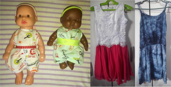 Sendo assim, destacamos as etapas de realização do grupo focal: a) Introdução – Recepção das crianças e apresentação da equipe de pesquisa (moderador e relatora); b) Identificação – Entrega a cada participante de um crachá em branco, para que escrevessem um nome fictício; c) Dinâmica das bonecas – O moderador organizou e selecionou bonecas, uma negra e uma branca, com características próximas, como tamanho aproximado do corpo, feições do rosto e indumentárias, para que as crianças escolhessem com qual gostariam de brincar e qual vestiria roupa do cotidiano e/ou roupa de festa, conforme figura a seguir.