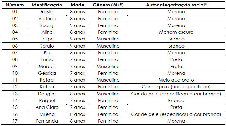 Nota: *Autocategorização racial realizada pela própria criança em aplicação de questionário verbal em 10.11.2018.