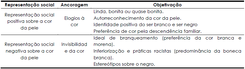 Assim, as representações contidas nos discursos das crianças participantes do grupo focal, a partir das bonecas e da contação de história, voltam-se à cor da pele como um dos pilares das relações raciais, que apresentam elogios à cor da pele e invisibilidade, retratando nas representações sociais das crianças seus modos de pensar e visualizar negros e brancos na sociedade. No quadro abaixo apresentamos as ancoragens e objetivações sobre a cor da pele nos discursos das crianças.