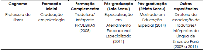 Ainda que o Decreto defina que a formação de docentes para atuar com o ensino de Libras deva ser realizada em curso de Letras Libras, no entanto, a escassez deste profissional no estado do Pará tornou-se algo evidente nos anos de 2005 a 2015. Neste sentido, inferimos que o edital que regeu o concurso ou contrato da referida professora estabelecia como requisito: graduação em qualquer área com Pós-Graduação na área da educação especial / educação de surdos.