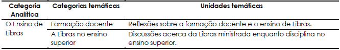 As categorias desse estudo partem de uma categoria analítica (inicial). A partir dessa categoria maior, as demais são agrupadas tematicamente, originando as categorias e unidades que são aglutinadas em função da ocorrência das temáticas que se interseccionam. Estas categorias estão subdividas para fins didáticos e uma melhor compreensão do leitor deste estudo, porém as mesmas se correlacionam entre si em seus conteúdos.