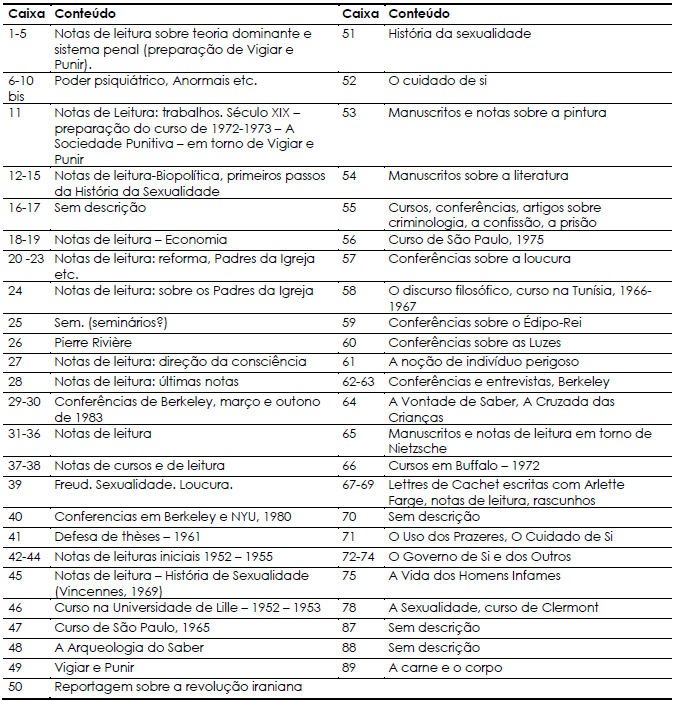 Uma parte do material, compreendendo o período entre 1986 e 1997, já havia sido enviado para o Institut Memoires de l’Édition Contemporaine (IMEC) para o qual também foi destinado o material em posse do Centre Michel Foucault, sediado inicialmente na Biblioteca de Soulchoir. Esses arquivos eram compostos por cursos dados no Collège de France, alguns seminários nos Estados Unidos, entrevistas e emissões radiofônicas (Albaric, 2019). O primeiro inventário feito depois que os arquivos foram adquiridos pela BNF foi realizado pelo próprio Defert e reorganizado posteriormente por pesquisadoras/es que se beneficiaram de uma bolsa de um ano, a Bourse Defert. Atualmente, estão acondicionados em 117 caixas (Biblioteca Nacional da França [BNF], 2020).