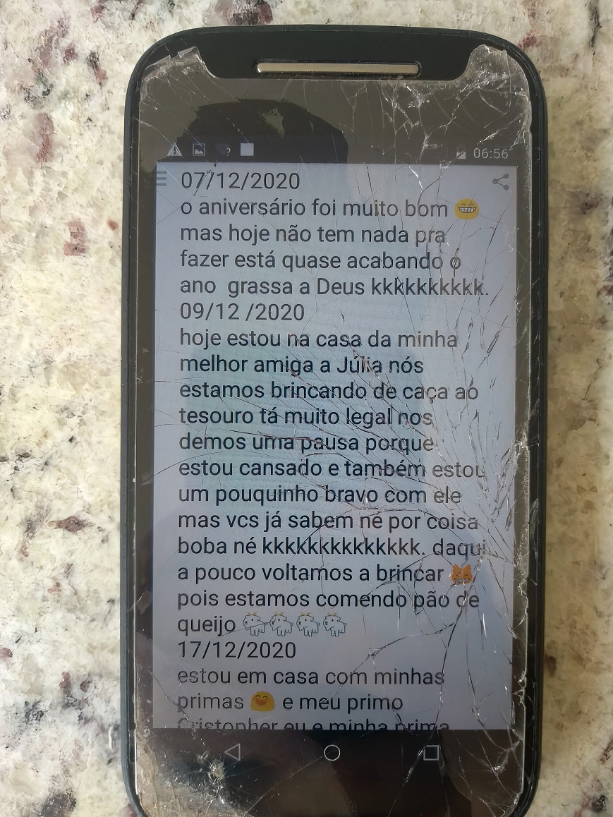 Durante a nossa primeira roda de conversa, Pando pediu para mostrar o que tinha no celular: eram textos, em formato de diário, que havia escrito no próprio telefone. Em seguida, disse-nos: “Um dia, sei lá, me deu um treco e eu resolvi escrever do nada o que estava acontecendo neste ano. Aí, escrevi do dia 31 de 2019 até 18 de 2020”. Isso entusiasmou e despertou a curiosidade do grupo. Marina bateu palmas: “Fez um texto no celular dele!”. Um pouco mais adiante, Lila pediu: “Fala só uma partezinha!”.