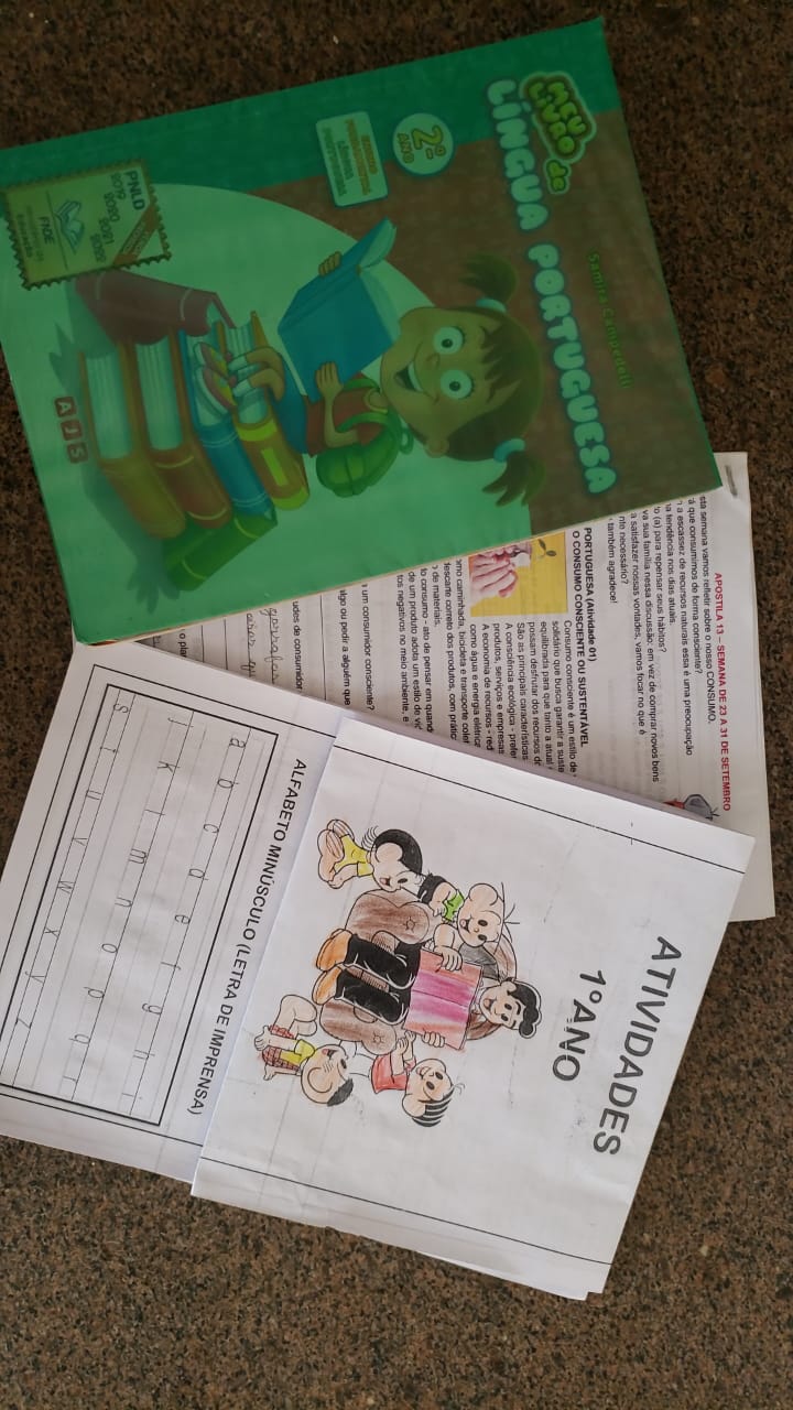 Pando estuda no 4º ano do Ensino Fundamental em uma terceira escola pública municipal. Ele levou para a roda sua pasta de apostilas e disse-nos “muita coisa, não é?”. Pando contou-nos que a escola enviava, toda quarta-feira, pelo Facebook, uma apostila com todas as matérias e o gabarito, na semana seguinte. Sua irmã mais velha foi quem imprimiu as atividades e o auxiliou tanto na realização dos exercícios como na correção. Além disso, disse-nos que estava fazendo uma prova que seria entregue em fevereiro. Em seguida, mostrou-nos as apostilas, apontando-nos detalhes nos textos sobre assuntos estudados como a dengue, a AIDS, o aumento das queimadas no Brasil e a história do telefone e da fotografia.