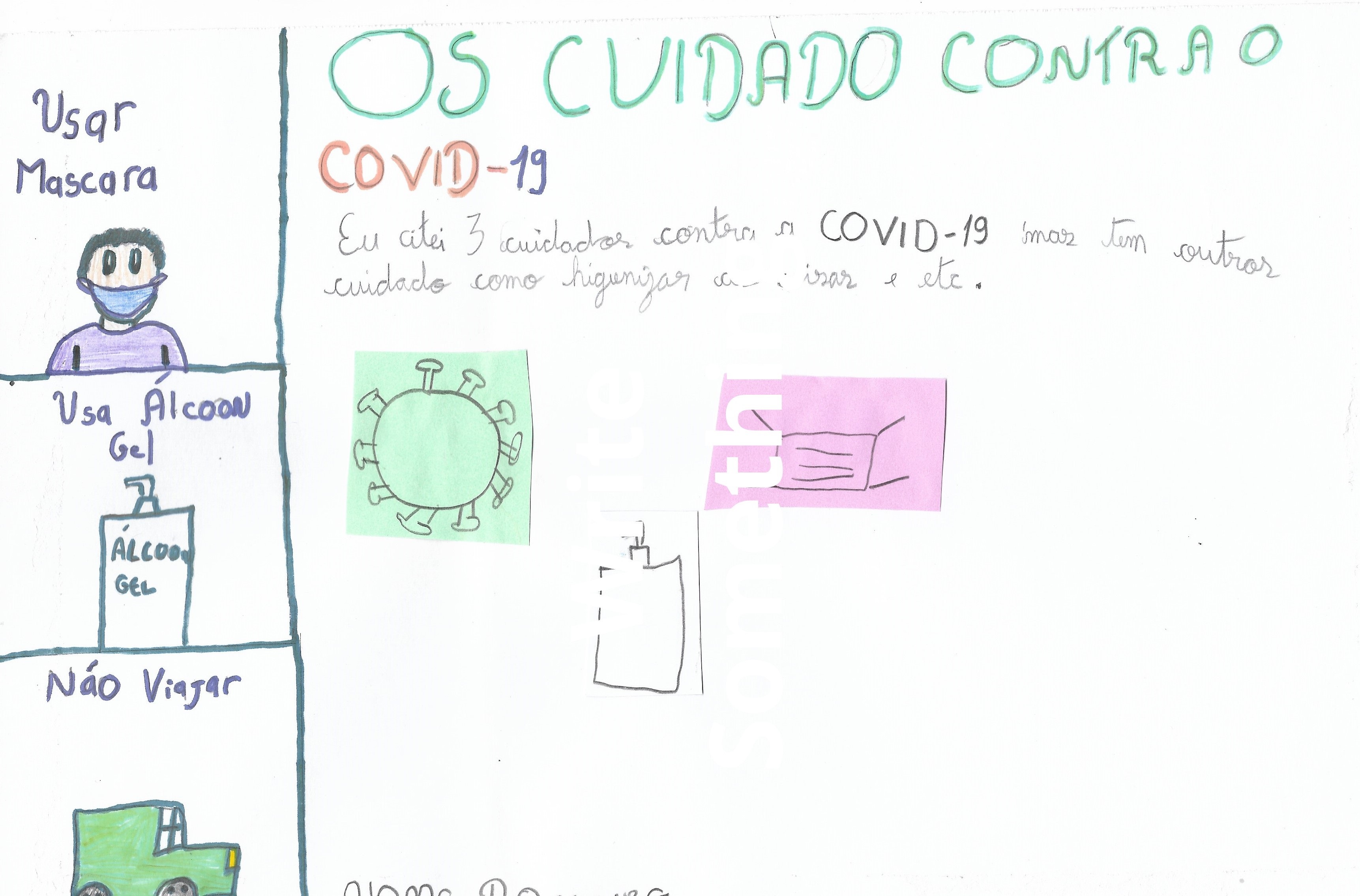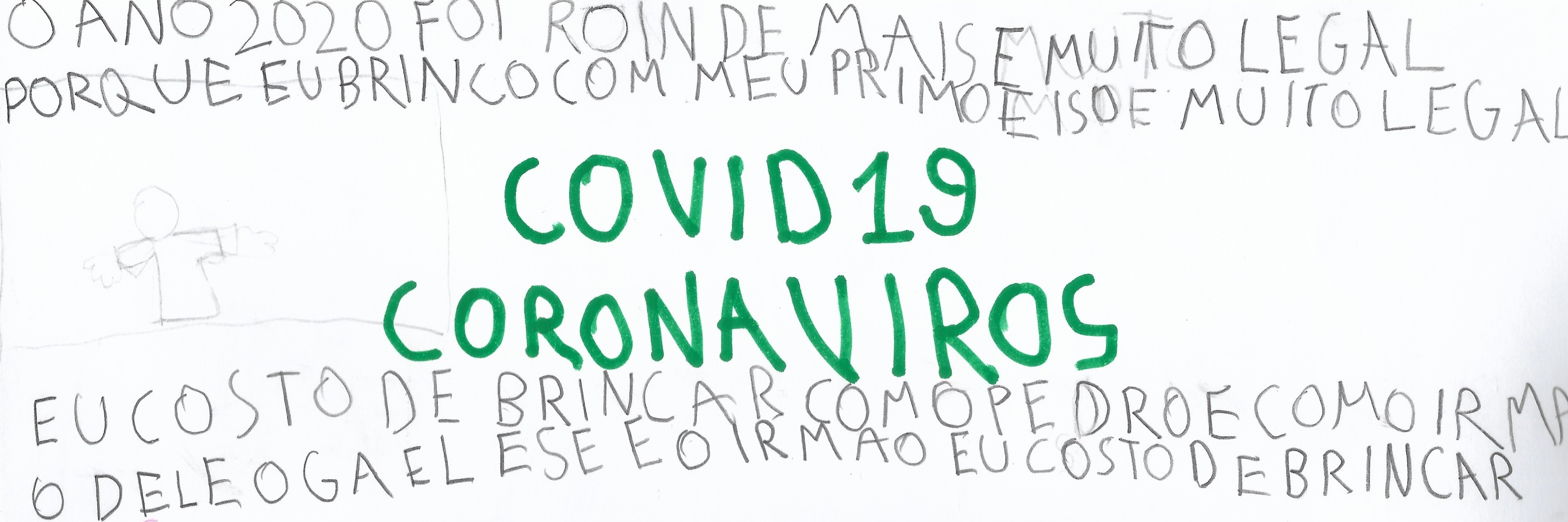 Para Ronaldo, as percepções e os significados do que se viveu em 2020 não se fixam no limite temporal e espacial proposto, transgredindo qualquer ordenamento desse tipo e, nesse sentido, ganha uma dimensão projetiva: “O ano de 2021 vai ser pior”. Ronaldo assim segue em seu registro: “O COVID-19 vem da China, a China que criou o Coronavírus ou COVID-19[2]. Foi muito perigoso. Todas as pessoas tinham que usar máscara para ir para a rua. Alguns nem acreditam”. Sua forma de compreender a realidade está impregnada pelo vivido, intensamente marcado pelo modo de perceber e sentir os acontecimentos. “O ano de 2020 foi péssimo”, disse Ronaldo no entremeio de uma conversa com as outras crianças durante a roda. Suas falas nos sinalizam uma realidade complexa que não se desfaz facilmente, como na passagem de um ano a outro, e que, mesmo sendo vivida em escala global, não é percebida do mesmo modo por todos, sendo que há aqueles que não compartilham da mesma compreensão, da mesma atenção, dos mesmos cuidados e, como afirma, “alguns nem acreditam”.