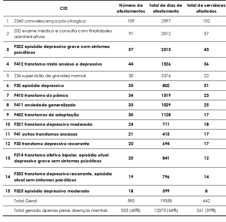 Os dados mostram que, dentre as principais causas dos afastamentos entre os servidores das duas instituições, doze de quinze são doenças mentais. As três que não pertencem ao rol dos transtornos psicológicos são afastamentos genéricos, como se pode ver: convalescença pós-cirúrgica, que se aplica a todos os casos de cirurgia; exame médico e consulta com finalidade administrativa, que também se aplica a todos os casos e não a uma doença específica e, por último, supervisão de gravidez normal que, tal como as anteriores, não diz respeito a uma situação específica de doença. Assim, tem-se que todas as doenças (com conjuntos específicos de sintomas) que formam o rol das quinze primeiras causas de afastamento do trabalho são transtornos mentais.