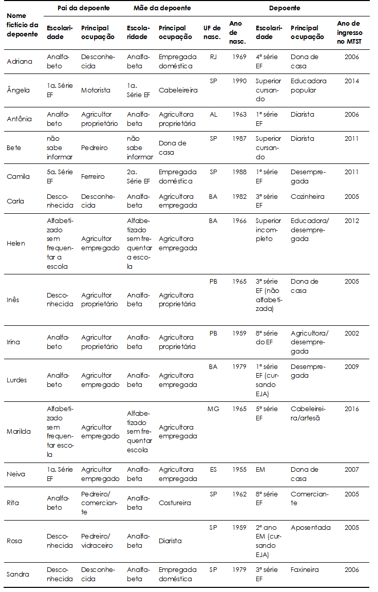 A pesquisa de doutorado que sustenta essa discussão tem caráter qualitativo, com uso de entrevistas biográficas em profundidade e observações nos espaços de atuação das mulheres sem-teto[2] (Carvalho-Silva, 2018). Foram entrevistadas 15 mulheres, entre 27 e 62 anos de idade, que se encontravam em diferentes momentos do engajamento político. Apresentamos abaixo um quadro com informações sobre as entrevistadas, cujos nomes foram alterados para garantir seu anonimato.