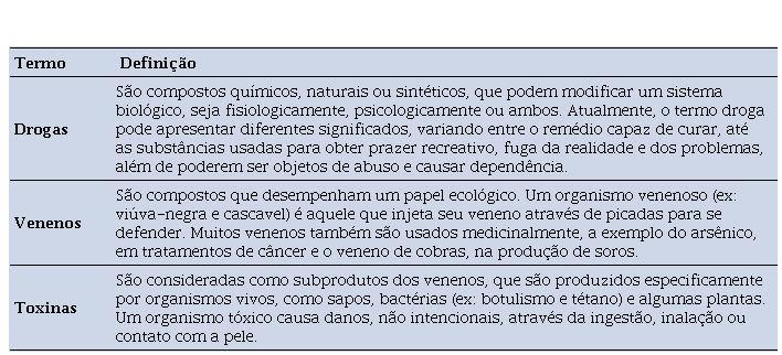 Para a identificação de passagens de textos referentes ao tema das drogas, buscou-se a definição do termo em Spencer (2012), no conteúdo de toxicologia forense, e em Lima (2013), em sua tese sobre educação em saúde e o uso de drogas. Durante a busca pelos conceitos contextuais, observou-se que alguns venenos, assim como as toxinas, podem desempenhar papel de droga a depender da dose e do contexto de aplicação da substância, assim como algumas drogas podem causar intoxicações ao organismo se administradas em doses elevadas. Por isso, consideramos pertinente incluir os descritores de drogas, venenos e toxinas. Tais definições foram organizadas no quadro 1, apresentado a seguir: