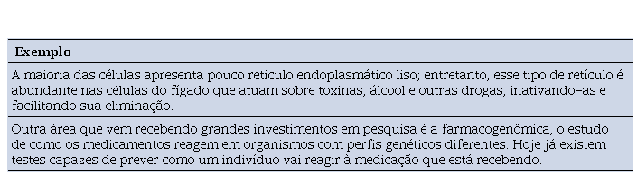 Ademais nota-se que a ciência biomédica está em constante desenvolvimento de sofisticação tecnológica para diagnósticos e tratamentos de diversas enfermidades. Sendo assim, as tecnologias e metodologias aplicadas na área da saúde estarão sempre em aprimoramento, um dos exemplos desse ramo é a farmacogenômica, como no segundo exemplo do quadro 3 (Amabis & Martho, 2016c, p. 94).