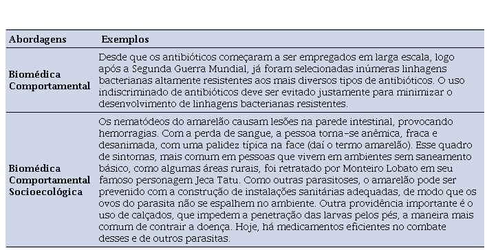 No início do primeiro exemplo (Amabis & Martho, 2016c, p. 123), fala-se de um processo orgânico de evolução quando se diz que linhagens de bactérias são selecionadas por causa do uso de antibióticos e, portanto, trata-se de uma abordagem biomédica. Já na segunda frase, constata-se que essas bactérias selecionadas advêm do uso irresponsável de antibióticos e que, por isso, devem evitar o abuso da medicação através de uma mudança de comportamento, o que remete ao problema da automedicação e também da iatrogenia, que é um problema decorrente de efeitos colaterais previsíveis de drogas terapêuticas (Labate et al., 2008).