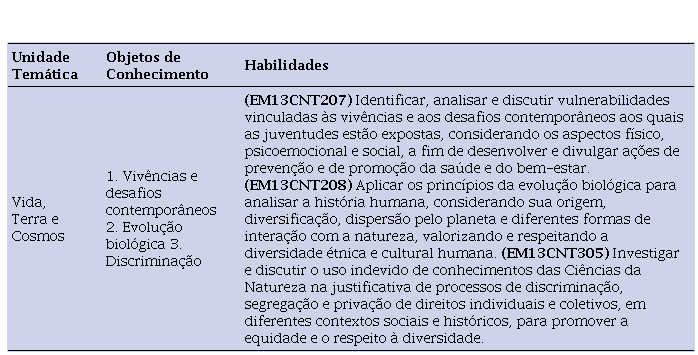 Na BNCC do ensino médio, esse aspecto biologizado fica mais evidente com a ocultação dos conteúdos condizentes com o debate sobre sexualidade na Unidade Vida, Terra e Cosmos. Nenhuma sugestão é indicada para o trabalho específico com os temas sexualidade e gênero (Quadro 2).