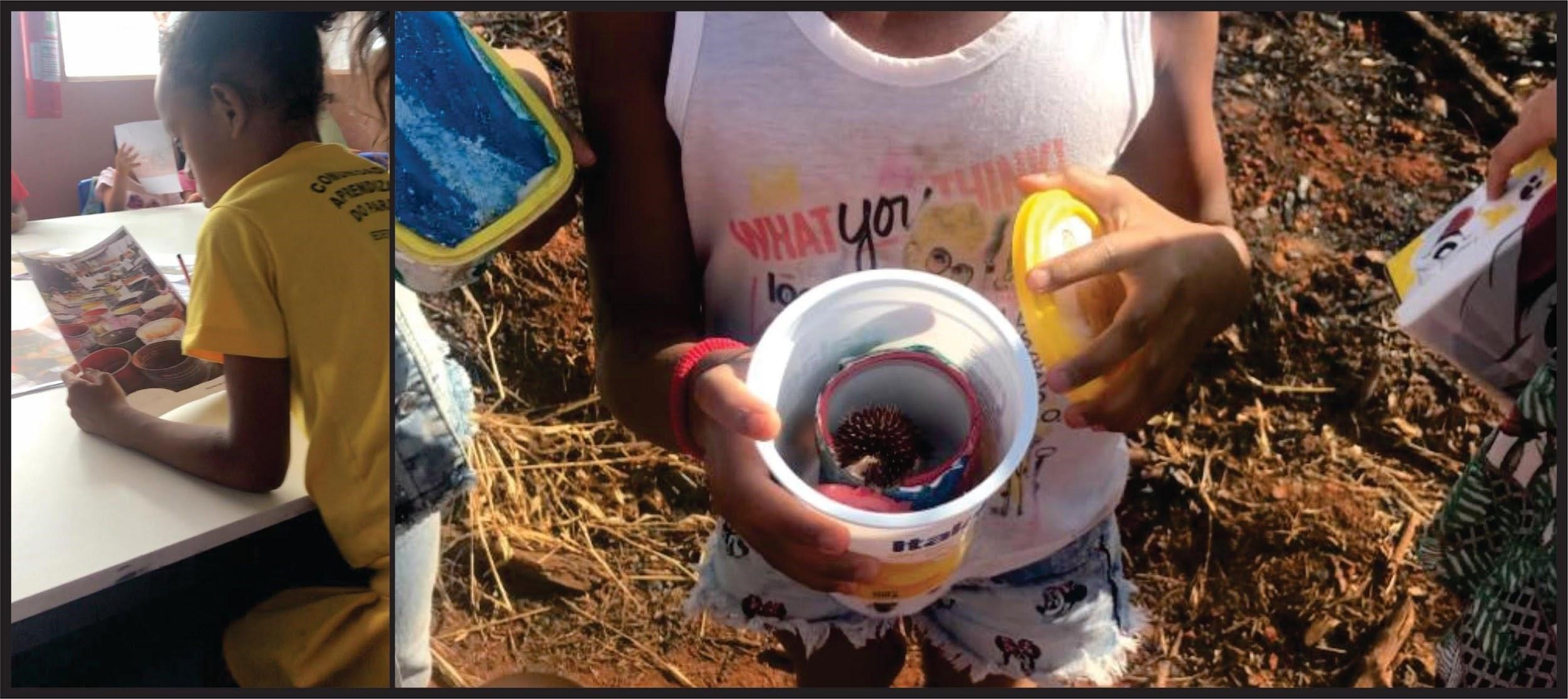 Nesse sentido, iniciamos as ações desta pesquisa pela proposta das crianças e juntas/os elaboramos as oficinas das latinhas. Cada criança guardava em seu potinho o que gostaria de colecionar das vivências na cidade, inspirando-se no menino do livro para poder guardá-las.