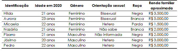 Nossas reflexões são resultado de síntese e informações coletadas em 13 escolas ocupadas em Goiânia, 05 em Aparecida de Goiânia, 10 em Anápolis, 01 na cidade de Goiás e 01 em São Luís dos Montes Belos. A partir deste mapeamento, a equipe de pesquisadores, envolvendo alunos em iniciação científica e voluntários[1], realizou 07 entrevistas, elaboradas a partir do roteiro produzido para a pesquisa nacional[2], com as e os ocupas da cidade de Goiânia, 04 mulheres e 03 homens, conforme quadro abaixo.