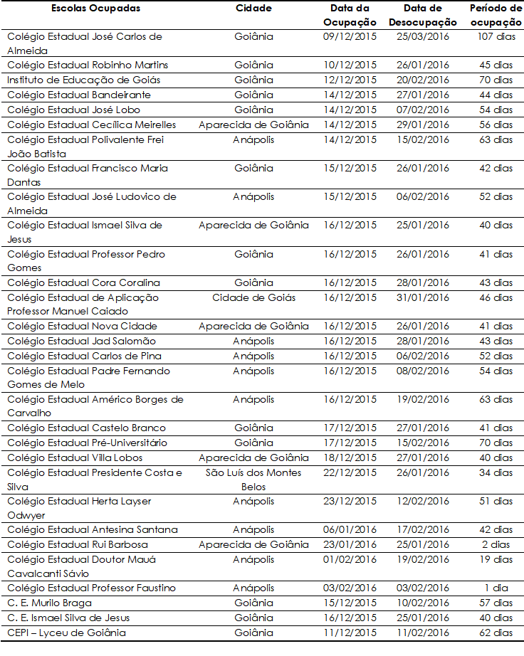 A ocupação das escolas públicas em Goiás pelos estudantes, ocorridas em 2015 e 2016, foi uma resposta ao despacho nº 596/2015 (Goiás, 2015), à política do Estado que buscava adotar modelo de gestão das escolas públicas estaduais a partir de parceria por meio de contrato de gestão com entidades privadas, qualificadas como Organizações Sociais de Educação (OSs).
