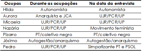 As ocupações de 2015 e 2016 caracterizaram outro modelo de fazer política, distante das formas tradicionais presentes nas instituições clássicas, como partidos e sindicatos. Mesmo assim, notamos uma presença significativa de duas forças políticas: de um lado, movimentos ligados ao campo autonomista, incluindo defensores do anarquismo e da autogestão; de outro, grupos comunistas, principalmente vinculados à UJR – União da Juventude e Rebelião, grupo juvenil ligado ao antigo PCR – Partido Comunista Revolucionário, hoje legalizado com o nome de UP – Unidade Popular. Identificamos também a presença de jovens vinculadas/os ao PT – Partido dos trabalhadores, PSOL – Partido Socialismo e Liberdade e JCA – Juventude Comunista Avançando, sendo que em alguns casos houve alterações e constâncias de posições políticas das pessoas entrevistadas entre o período das ocupações e das entrevistas, mantendo-se o posicionamento no campo de esquerda, conforme apresentamos no quadro abaixo.