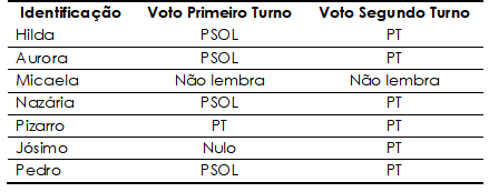 Assim, de forma as vezes “envergonhada” ou “tímida”, quase todas/as as/os entrevistadas/os declararam que votaram no PSOL ou PT no primeiro turno das eleições presidenciais de 2018, e no PT, no segundo, conforme quadro abaixo: