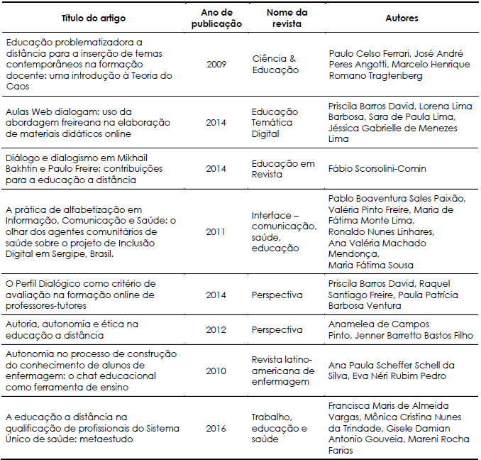 Acredita-se que os trabalhos seriam coerentes com a perspectiva teórico-filosófica de Paulo Freire por considerarem categorias de seu pensamento, articulando-os em suas pesquisas empíricas e discussões de caráter teórico. Em alguns artigos que compuseram a amostra, parte dos autores deixa explícito que certos conceitos freireanos são muito importantes para que os estudantes desenvolvam autonomia e criticidade. Exemplo disso são as considerações de Silva e Pedro (2010, p. 74), para quem as tecnologias de informação e comunicação (TICs) oferecem possibilidades de estímulos e desafios para o exercício da curiosidade, o que pode auxiliar o aluno na construção de sua autonomia.