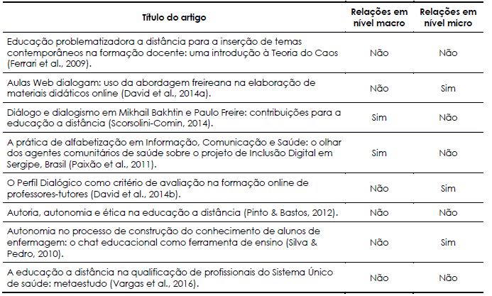 Do total de 8 artigos, em apenas 2 os autores trataram de relações de exploração em nível macro e 3 em nível micro. Dessa forma, embora a maioria dos artigos seja coerente com a perspectiva freireana, muitas vezes ficaram restritos a aspectos mais voltados às questões entre tutor/professor X discente, sem considerar a politicidade implícita nessa relação. Portanto, apenas parcialmenteos artigos teriam sido desenvolvidos a partir de uma abordagem crítica nos limites desse trabalho. As razões para isso não foram identificadas nesta fase da investigação, sendo interesse das pesquisadoras a continuidade dos estudos da amostra também com este objetivo.