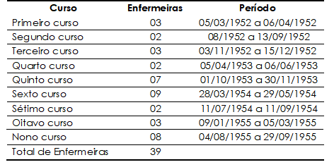 Entre os anos de 1952 e 1955 foram realizados nove Cursos de Treinamento de Educadores de Base, discriminados no Quadro 1, os quais contaram com o envolvimento de diversos profissionais; na enfermagem, por exemplo, foram registradas 39 participantes. Não obstante, a CNER considerava esse número insuficiente para o atendimento das demandas surgidas nas missões: