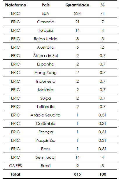 Foram identificadas publicações de 25 países diferentes, sendo que os Estados Unidos lideram no número de produções (164), seguidos por Turquia (16) e Austrália (15). Na plataforma CAPES, dos 17 resultados na pesquisa realizada, apenas 4 teses e 5 dissertações tinham real relação com os descritores metacognição e ensino superior.