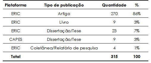 No que tange ao tipo de publicação, foram encontradas publicações no formato de artigo científico, seguido de dissertações/teses e livros. Tal diferença pode significar que no contexto acadêmico artigos são cada vez mais utilizados como forma de comunicação científica, em detrimento de outros formatos.