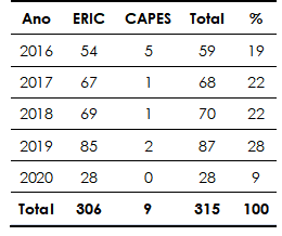 A abordagem foi qualitativa de tipo estado do conhecimento, visando analisar apenas um recorte das publicações realizadas sobre o tema a ser investigado (Romanowski & Ens, 2006). Foi realizado levantamento nas plataformas Educational Resources Information Centre (ERIC)[1] com os descritores “metacognition” AND “higher education” e no Catálogo de Teses e Dissertações da CAPES[2], com os descritores “Metacognição” e “Ensino Superior”. A busca resultou em 306 publicações na ERIC e em 17 publicações na CAPES, considerando o período de 2016 a 2020. A partir dessa primeira fase, foi realizada a leitura de todos os resumos encontrados.