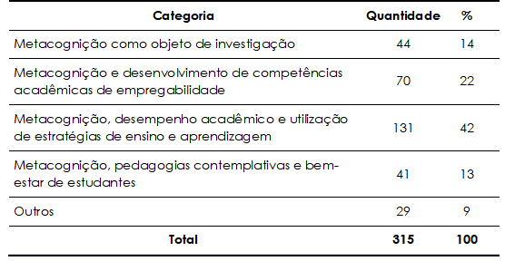 A categoria denominada “Metacognição, pedagogias contemplativas e bem-estar de estudantes”, com 41 publicações (13%), revelou um campo recente de pesquisas que aplicam a metacognição e sua relação com o quanto a saúde mental pode interferir no processo de aprendizagem no contexto universitário. Nessas publicações, a metacognição surge como caminho para a identificação da capacidade de automonitoramento de estudantes e docentes acerca de sua própria atividade mental, para que, por meio de técnicas e outras estratégias em sala de aula, se possa promover um ambiente mais saudável.