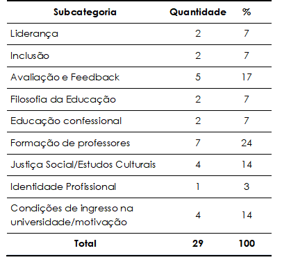 Tal categoria se aproxima do que Duffy (2005) aponta como caminho para a formação, pois esse tema não é normalmente relacionado à metacognição, em decorrência do formato de treinamento que muitos programas adotam. Na formação de professores, a metacognição pode contribuir na oposição à mera conformidade técnica. Vale ressaltar o baixo número de pesquisas nessa subcategoria, além do enfoque das publicações não necessariamente estar vinculado à aplicabilidade metacognitiva – como visto em Adasi et al. (2020) –, evidência essa que dialoga com o que Rosa e Villagrá (2018) afirmam sobre as poucas contribuições para o uso da metacognição em sala de aula. Logo, é possível que a pouca aplicabilidade de estratégias didáticas fundamentadas no desenvolvimento metacognitivo possa ter relação com o baixo número de docentes que possuem tal abordagem contemplada em sua formação inicial ou continuada.