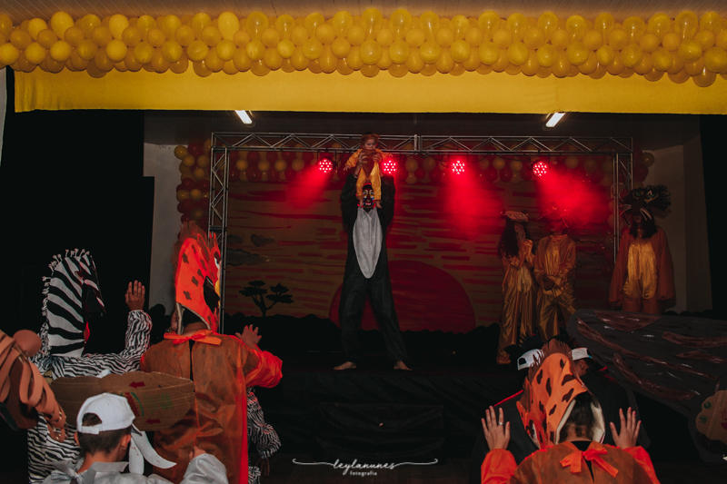 Os ensaios aconteceram nas aulas das disciplinas envolvidas no projeto, sobressaindo-se nas aulas de Arte e Educação Física, sendo sempre acompanhados e mediados pela professora orientadora, e foi durante estes que as coreografias foram criadas. Nas disciplinas de Arte e Educação Física, os estudantes desenvolveram os conceitos corporais, de expressão artística, movimento, expressividade, desenvolvimento motor e espacial; nas aulas de Língua Portuguesa, os estudantes desenvolveram a dramatização, utilizando recursos inerentes ao teatro; e nas de Língua Inglesa, da oralidade para coordenar os passos da dança com a pronúncia da letra da música. Em relação a isso, o Estudante 7 salienta que “Essa realização que acontece na escola proporciona o desenvolvimento em áreas como em arte, seja clássica ou moderna, arte cênica, trabalha com outras culturas de fora do Brasil” (Diário reflexivo, Estudante 7, 2019). A Figura 4 ilustra a fala do Estudante 7, que mostra uma apresentação relacionada ao musical Rei Leão em que os estudantes tiveram acesso a uma nova experiência cultural e, além de dançar, utilizaram elementos próprios do teatro a fim de dramatizar, dando mais sentido ao musical: