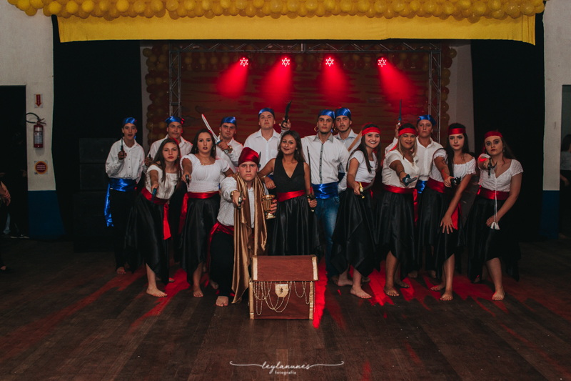 Para o dia do evento, além da coreografia pronta, são necessários outros elementos que contribuem para o resultado final, que são os cenários e os figurinos. A princípio, propiciar isso seria um grande desafio, visto que a escola não possui condições financeiras de arcar com tais despesas. Porém, são realizadas arrecadações, como rifas, pedágios e pedidos de patrocínio. Para tanto, os estudantes, pais e professores mobilizam-se no sentido desta arrecadação; o projeto recebe ainda doações de material e de mão de obra, como evidencia a Docente 3: “Um dos grandes desafios que encontramos foi, sem dúvida, a falta de verbas para o custeio dos figurinos, decoração e cenários e outros materiais; que logo foi resolvido com a união da equipe, promovendo eventos, tais como rifas e pedágios que solucionaram o problema” (Diário reflexivo, Docente 3, 2019). A mesma complementa, ressaltando a importância do trabalho em equipe na organização de todo projeto, bem como a participação das famílias: