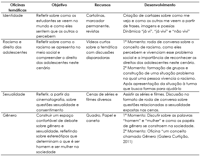 Inserir-se neste espaço para o desenvolvimento das ações extensionistas convocou o grupo de universitários a refletir sobre a importância de planejar ações coerentes com a realidade social e cultural dos professores, estudantes e familiares que compunham a comunidade escolar. A partir desse reconhecimento, o projeto apresentou um plano de ação à direção da escola que contemplou o desenvolvimento de oficinas temáticas sobre temas como identidade, racismo, direitos das(os) adolescentes, gênero e sexualidade. O objetivo de cada oficina foi pensado a partir do contexto social e cultural da realidade local e foi sendo modificado na medida em que novas demandas de discussões sobre a temática emergiam do grupo de estudantes. O número de participantes de cada uma delas foi de, em média, 15 estudantes. As oficinas foram mediadas, geralmente, por quatro pessoas distribuídas entre acadêmicas(os) de graduação, psicólogas(os) e acadêmicas(os) da pós-graduação. Os encontros tiveram a frequência quinzenal, com duração de, em média, duas horas cada. Ocorreram nas salas de aula da escola, em horário de disciplinas curriculares ofertadas pelos professores que, no mesmo momento, participavam de outra proposta voltada à formação docente continuada desenvolvida pelas professoras universitárias responsáveis pelo projeto. O quadro 1 sistematiza os objetivos das oficinas temáticas citadas, bem como seu desenvolvimento.