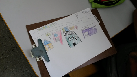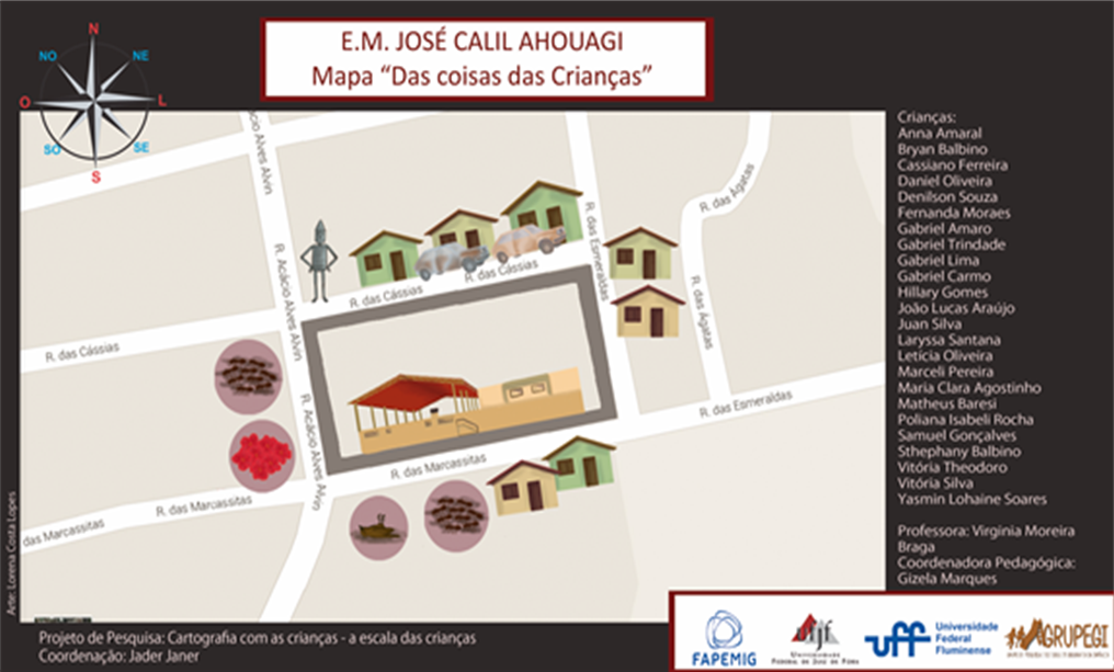Nesse momento não havia mais risos. O silêncio era a força da palavra que se entremeava com a narrativa que provinha da mesa. No slide projetado estava o mapa feito com as crianças, a partir da caminhada no lado externo da escola.
