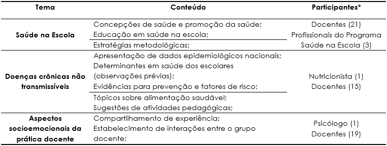 Diante da preocupação com os aspectos do estilo de vida dos escolares, associada à necessidade de aproximação da família com o cotidiano escolar, a educação em saúde foi definida como tema central. Com isso, três encontros foram idealizados, coletivamente, a fim de estimular a reflexão dos docentes, bem como incrementar subsídios teóricos. O Quadro 1 apresenta a síntese dos temas e conteúdos contemplados em cada encontro.