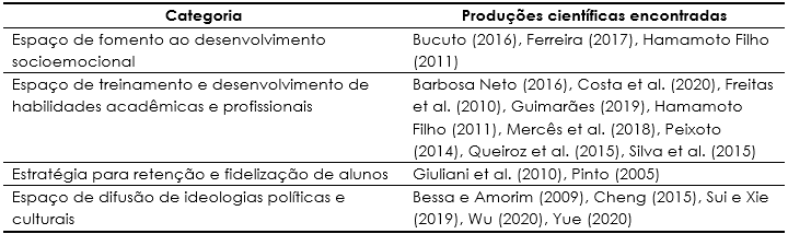 Ao finalizar a leitura dos 18 trabalhos, sendo 14 em português e quatro em inglês, pode-se perceber que os textos abordam os grupos estudantis extracurriculares em quatro categorias distintas: espaço de fomento ao desenvolvimento socioemocional; espaço de treinamento e desenvolvimento de habilidades acadêmicas e profissionais; estratégia para retenção e fidelização de alunos; e espaço de difusão de ideologias políticas e culturais. Estas categorias são o resultado emergente dos textos encontrados, ou seja, são categorias a posteriori.