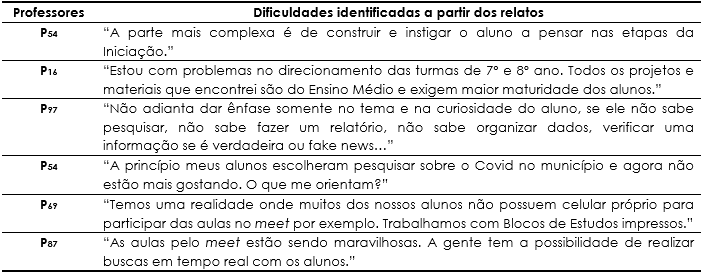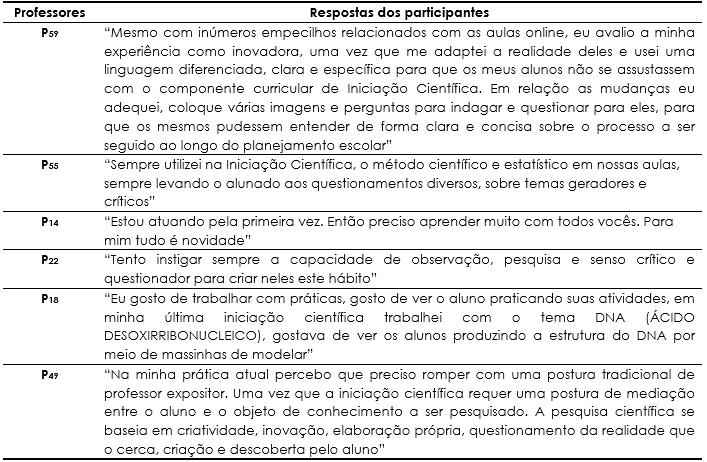 Em relação ao quadro 6 ainda, pode-se perceber, nas falas dos professores 54, 16 e 97, como foi difícil para eles deixar o ensino expositivo de lado e dar autonomia para os estudantes pensarem por si só, dado que “o ensino por investigação é particularmente interessante quando se pretende contribuir para o desenvolvimento da autonomia que se dá mediante o engajamento dos estudantes em atividades de interesse próprio” (Sá, 2009, p. 170). Entretanto, existem professores que conseguiram dar autonomia, mas ainda não sabiam bem o que fazer depois, como P54, talvez por falta de experiência nessa área da IC ou com esse componente curricular ou com o ensino investigativo. Reafirmamos, em decorrência disso, a necessidade contínua do oferecimento de formação aos professores para oportunizar subsídios teóricos e práticos para sanar essas dúvidas relacionadas aos conteúdos específicos, como esse, da IC, que é a proposta atual da nova BNCC.