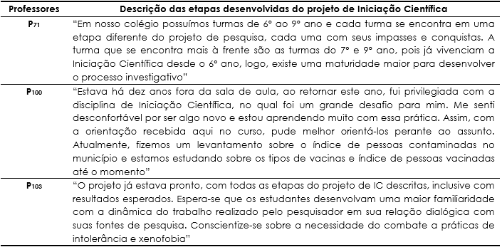 Além disso, também foi esclarecido como seria a atividade final a ser entregue quinze dias depois desse encontro para a posterior análise e devolutiva no último dia. A atividade foi intitulada: “Faça um esboço das etapas do projeto de Iniciação Científica que seus alunos já conseguiram desenvolver até o momento”, que se desenvolveu como descrito a seguir.