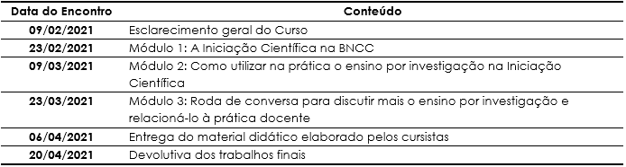 No dia 09/03/21 utilizou-se uma série de exemplos práticos, materiais postados no Google Classroom, como o caderno de Iniciação Científica, um material produzido pela superintendência estadual de ensino de Goiás, para auxiliar os professores a elaborarem, juntamente com os estudantes, o projeto de IC. Já no dia 23/03/21 foi realizada uma roda de conversa para discutir o ensino por investigação, relacionando-o à prática docente. Esse encontro representou um momento importante para a obtenção de dados desta pesquisa, uma vez que nesse momento os professores puderam compartilhar experiências docentes e dizer se o curso estava ajudando na prática profissional.
