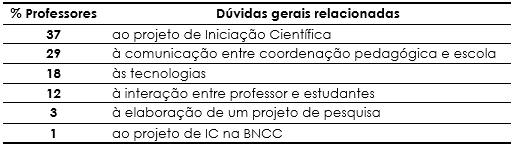 Ao analisar os resultados, foi possível notar que a maior parte das dúvidas estava relacionada ao projeto de IC, em seguida vinham dúvidas relacionadas à comunicação entre coordenação pedagógica e escola, a problemas com tecnologias, problemas na interação entre professor e estudantes, dificuldades na elaboração do projeto de pesquisa e, por último, problemas relativos ao projeto de IC na BNCC.