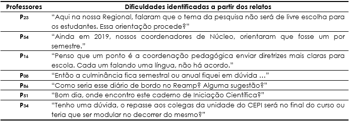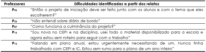 A categoria Dúvidas relacionadas ao projeto de IC foi a que apresentou maior índice, tendo sido identificados diferentes tipos de problemas, como formular o tema, o que é o diário de bordo, como construir um projeto com os estudantes, além do fato de que havia professores que estavam nesse componente curricular pela primeira vez e, por isso, tinham que aprender a elaborar o projeto para colocá-lo em prática (Quadro 3).