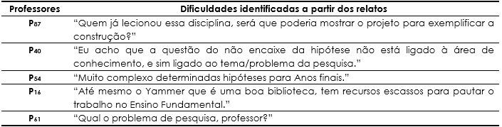 Os professores apresentaram dúvidas em formular, juntamente com os estudantes, o tema, o problema, a hipótese, onde buscar material para a revisão de literatura, entre outras etapas que compõem a estrutura de todo projeto de pesquisa. Em geral, essas dúvidas poderiam ser minimizadas se tivesse sido utilizado o modelo de pesquisa na formação inicial desses professores, preenchendo as lacunas existentes entre teoria e prática. Nesse modelo de formação, os professores aprendem a trabalhar em conjunto, detectar temas, solucionar problemas, auxiliando os estudantes e trazendo mudanças positivas para a escola. Quando os professores atuam como pesquisadores, eles se tornam bons professores, pois aprendem a enxergar principalmente as dificuldades dos estudantes e a auxiliá-los no desenvolvimento das ações e, na prática dos projetos (Imbernón, 2010).