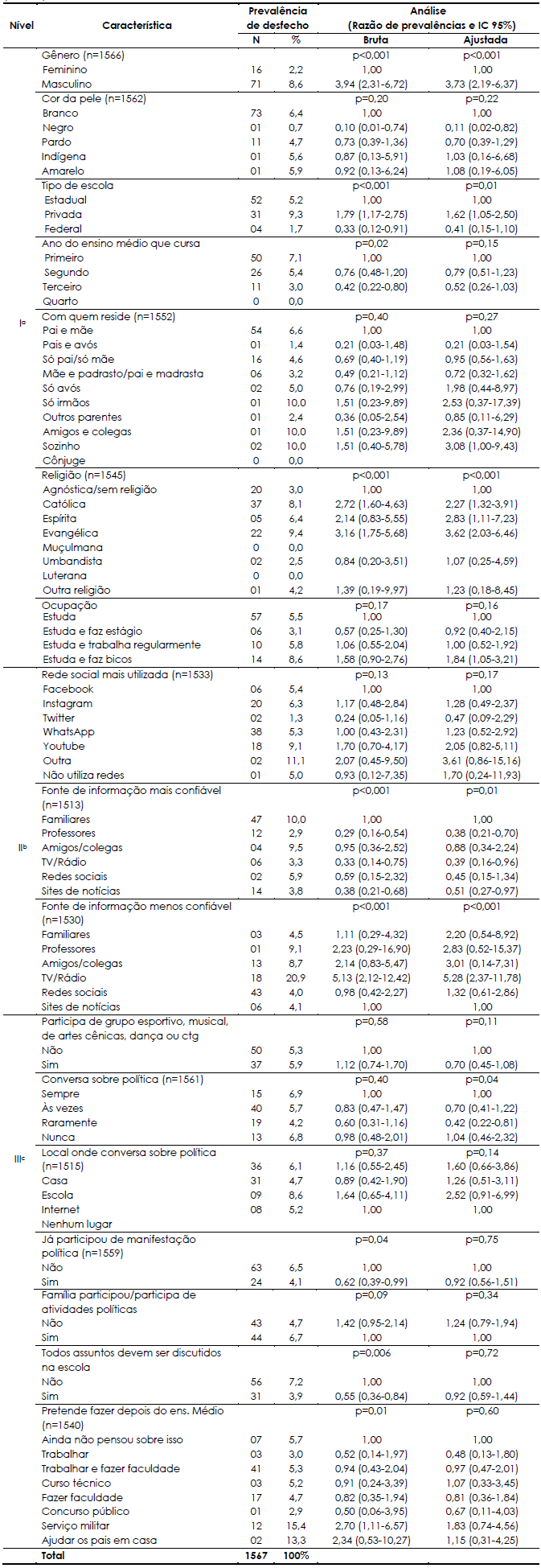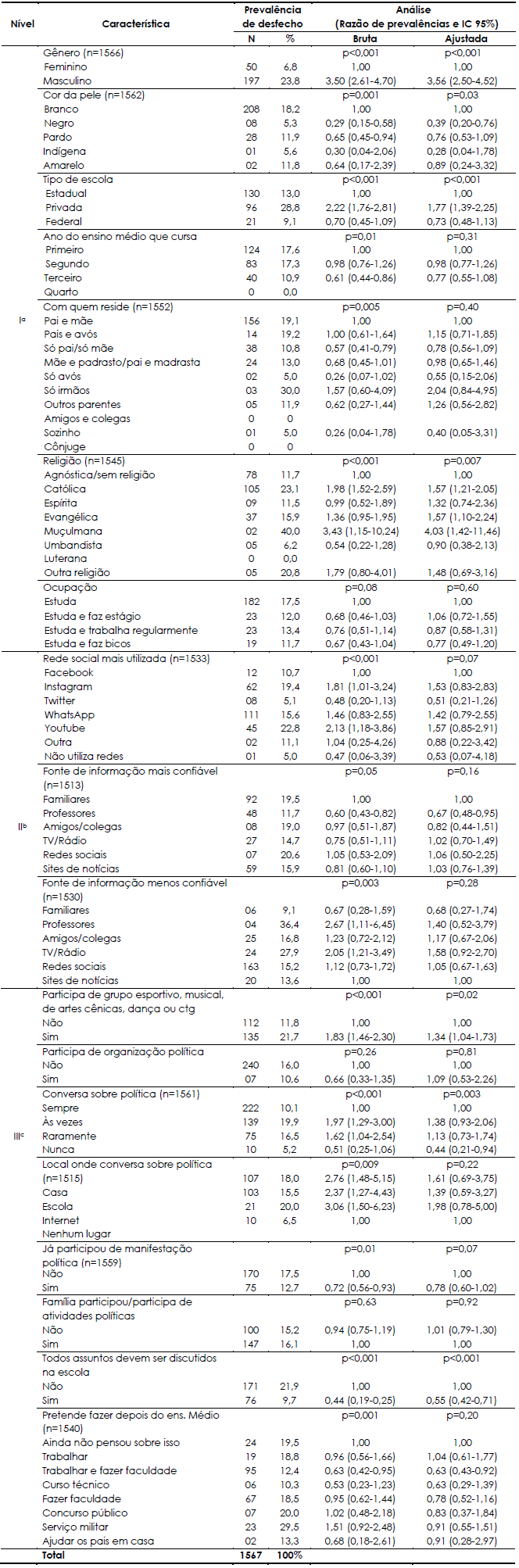 Neste segmento, considerando os estudantes que responderam se identificar nas numerações 9 e 10 (extrema direita), encontram-se 5,5% da amostra (87 estudantes). Na análise ajustada, mostraram-se significativamente associados ao desfecho as variáveis gênero, tipo de escola, religião, fonte de informação mais confiável, fonte de informação menos confiável e conversar sobre política.